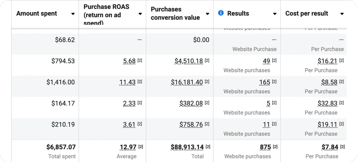In just 30 days, we turned $6.8K in ad spend into $89K in sales for an e-commerce brand achieving 875 purchases at only $7.84 each with a 12.9x ROAS.
